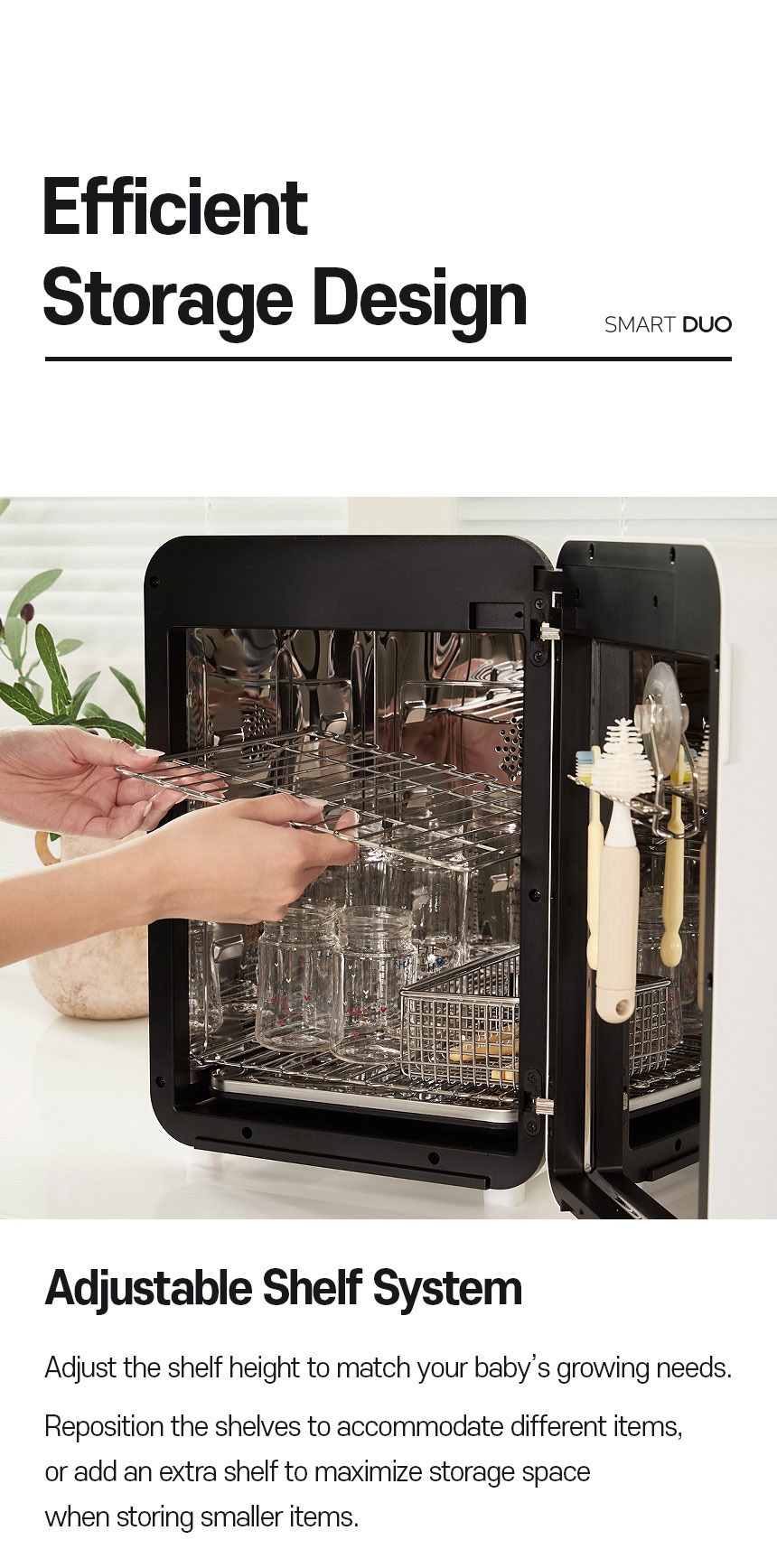 π§Έ Adjustable Shelf System: Grows with your baby! Includes 2x Stainless Steel Shelves that can be adjusted to fit tall bottles, breast pump parts, and weaning bowls.