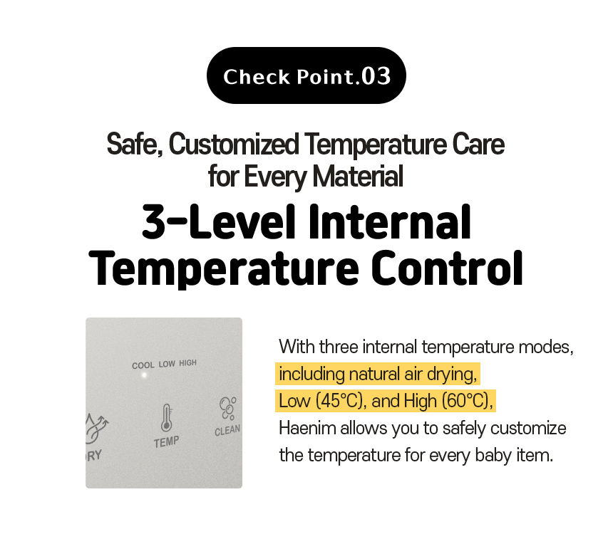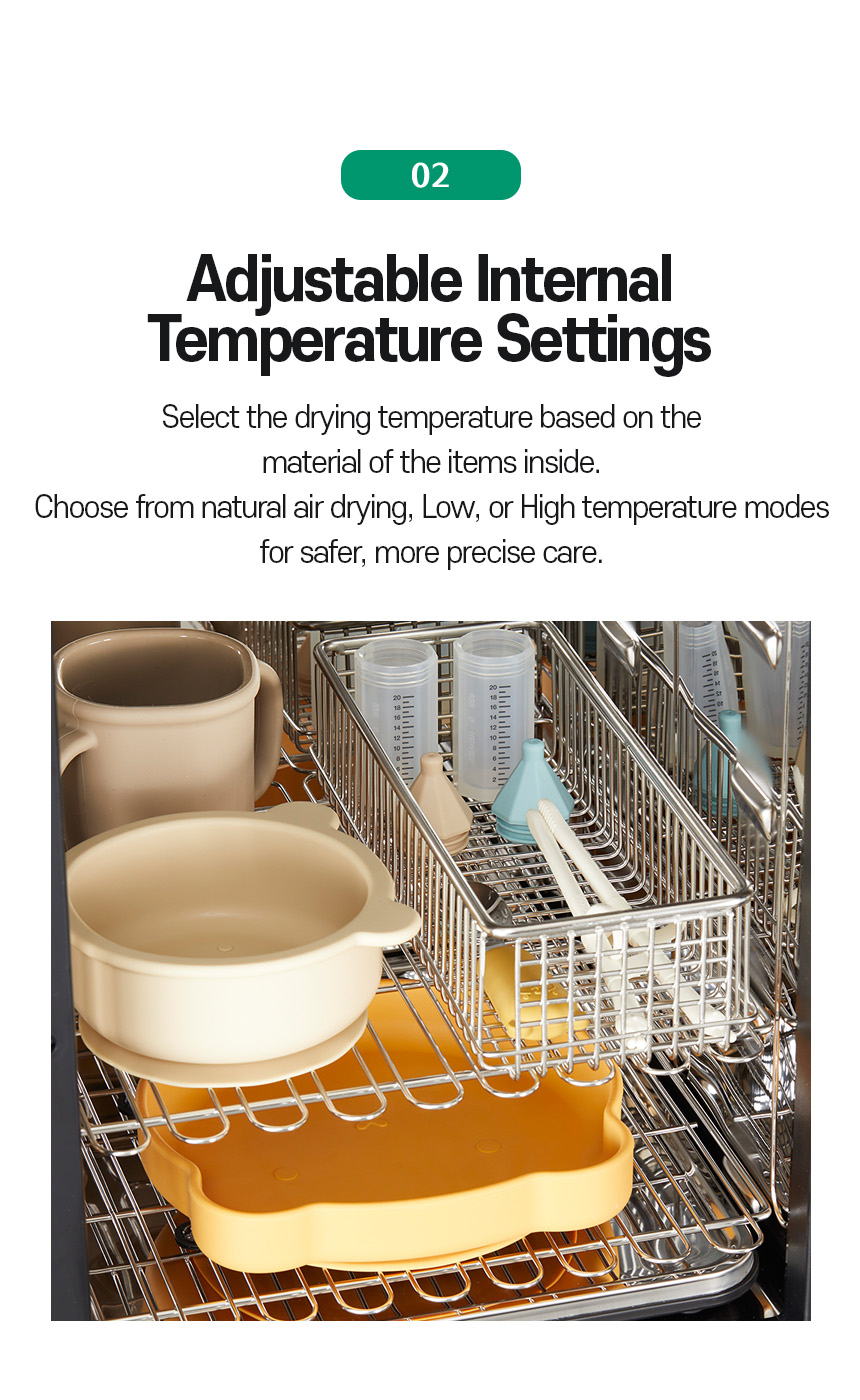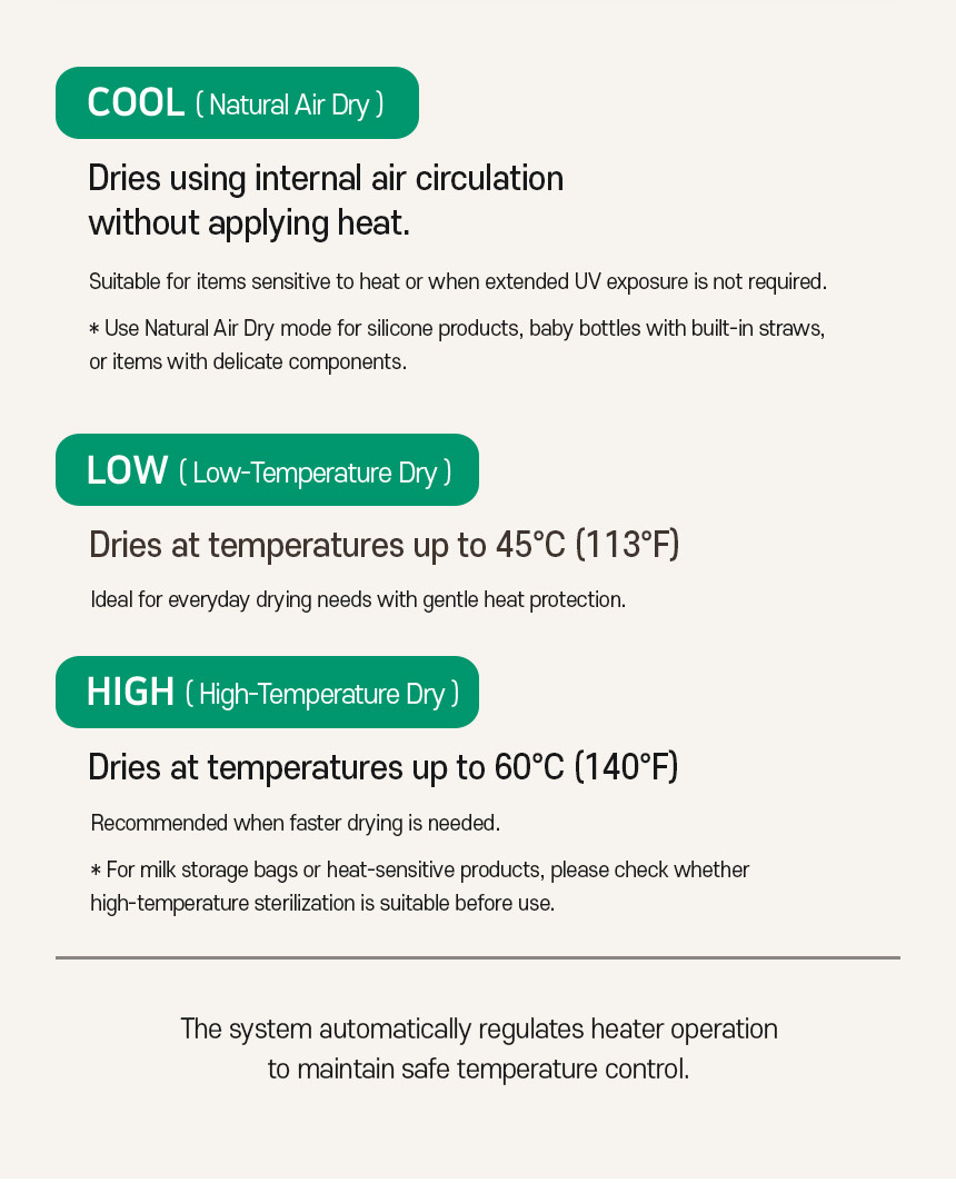 π‘οΈ Smart 3-Level Temperature Control: 100% safe for all baby items! Customize your drying with an advanced PTC Heater to prevent melting or warping:
