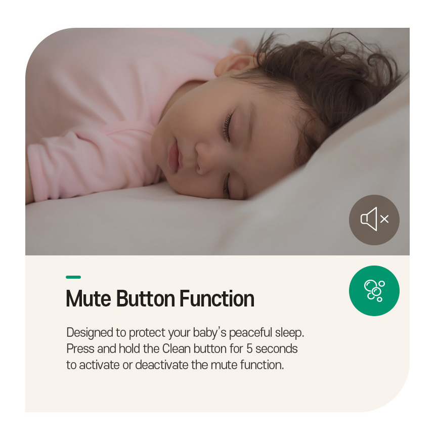 π€« Baby-Friendly Mute Function: Protect your little oneβs peaceful sleep! Simply press and hold the Clean button for 5 seconds to activate or deactivate all button sounds.