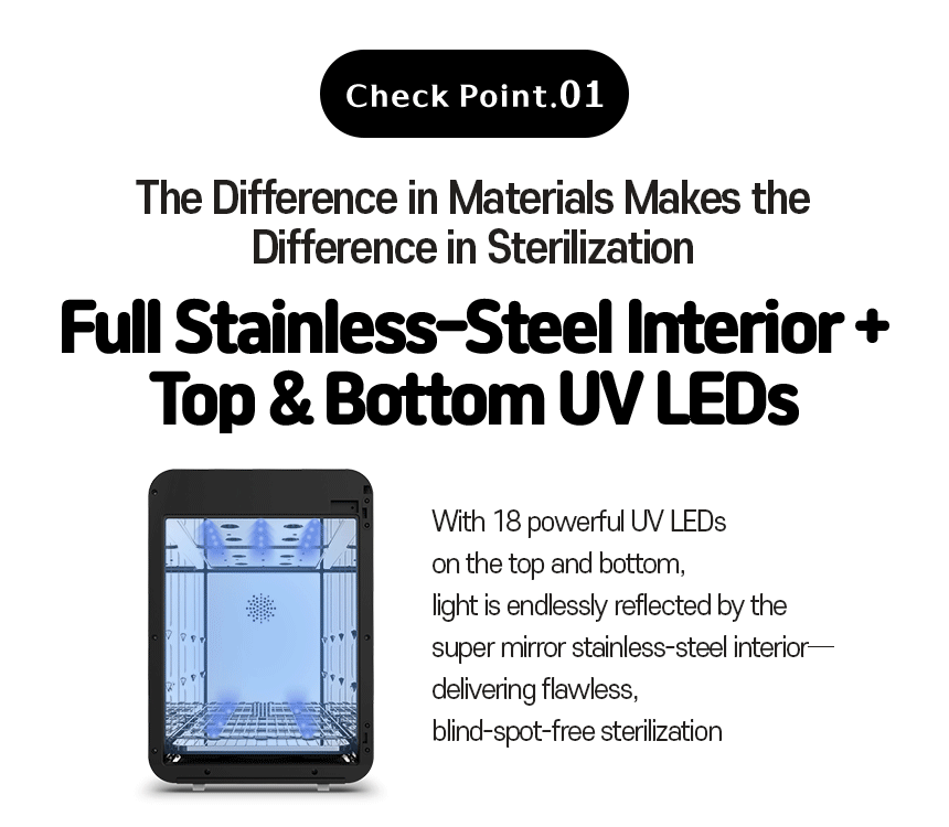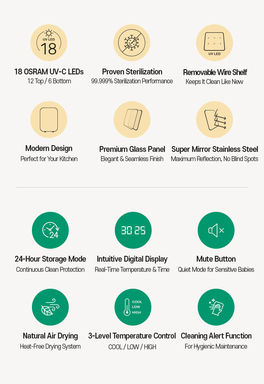 π‘οΈ Ultimate 99.999% Sterilization: Powered by 18 Premium OSRAM UV-C LEDs (12 top / 6 bottom) and a Super Mirror Stainless-Steel Interior that maximizes light reflection for flawless, blind-spot-free sterilization.